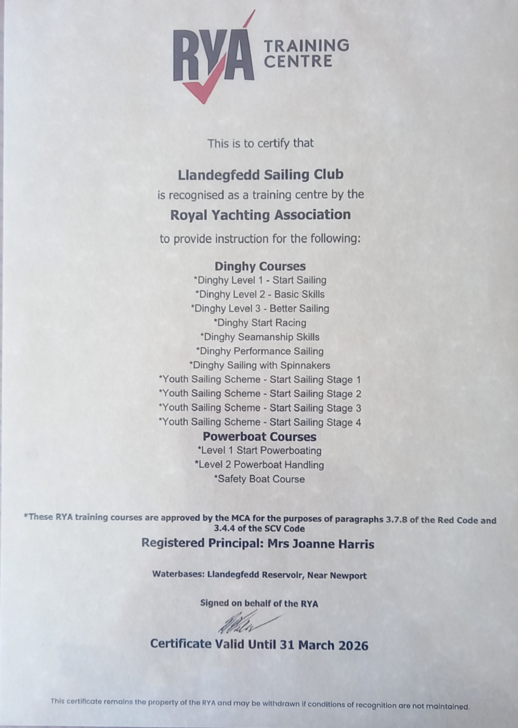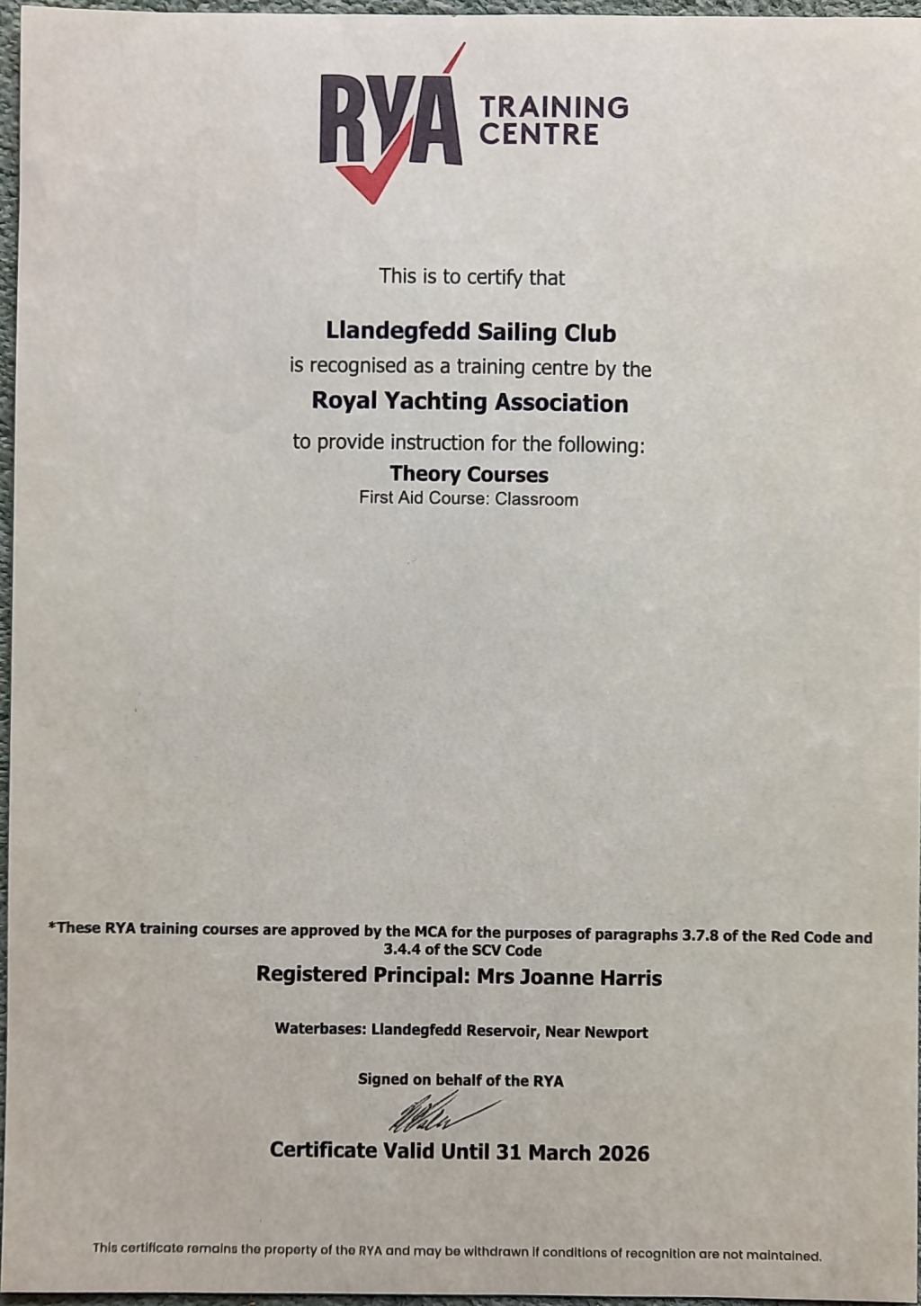 Royal Yachting Association accreditation certificates
